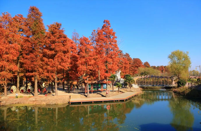 登高俯瞰,一排排高大的池杉静静伫立,犹如簇簇焰火般缤纷盛放,纤细秀美的枝叶色彩愈发明艳