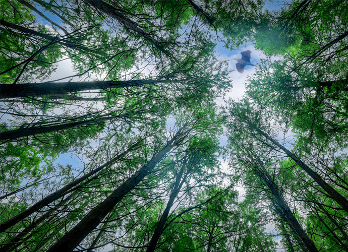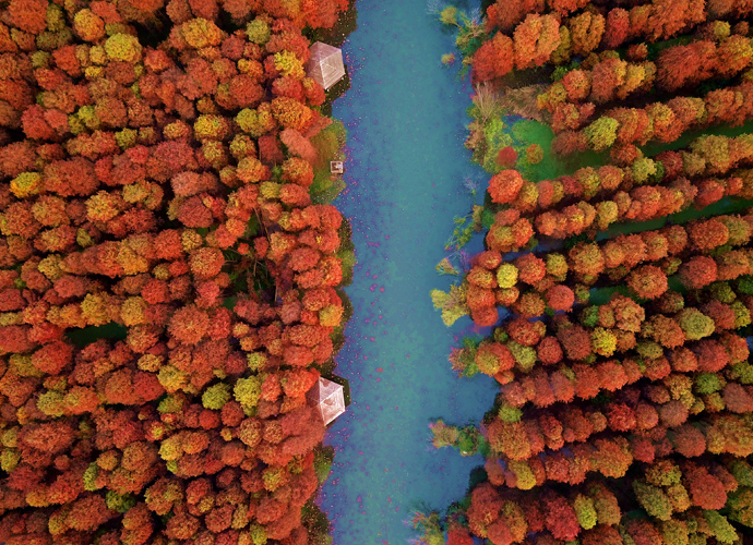 登高俯瞰,一排排高大的池杉静静伫立,犹如簇簇焰火般缤纷盛放,纤细秀美的枝叶色彩愈发明艳