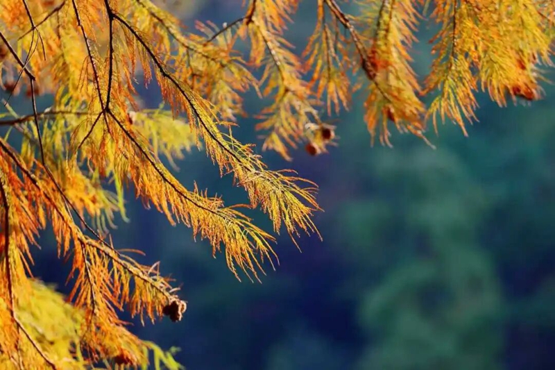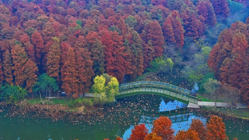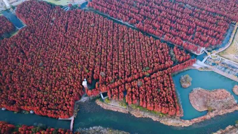 一池碧水托起成片翠绿池杉,阳光穿过枝叶洒下斑驳光影。走在木栈道上,连呼吸都带着草木清香。而现在,寒风一吹这里就完成了一场华丽蜕变,池杉的叶子像是被大自然调了色盘,从顶端开始染上浅红、深红,再到接近树干的焦糖棕色,层层叠叠晕染开来。