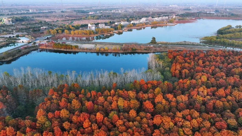 站在林中的揭阳塔上,整个清水潭的面貌尽收眼底。成片的池杉林像是铺在水面上的红色绒毯,深浅不一的红色交织成自然的纹理,中间蜿蜒的水道像是蓝色的丝带,将红杉林分割成一幅灵动的画卷。这种视角下,才能真正体会到“层林尽染”的深意。远处的芦苇荡泛着浅黄,与红杉林相映成趣,构成了秋日独有的色彩碰撞。这可是只有我们的粉丝才能抢先看到的独家风景,赶紧存图发朋友圈晒晒吧!