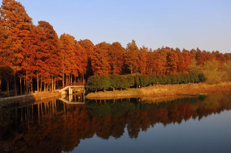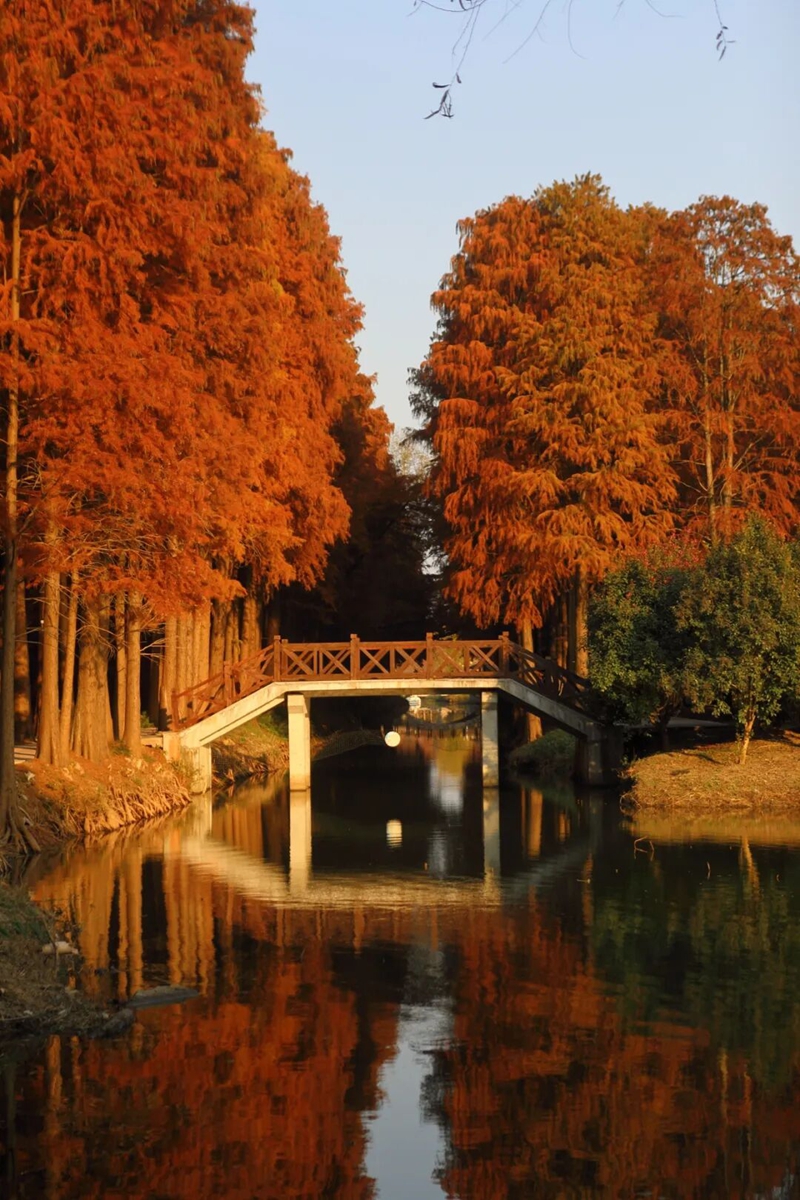 现在,你所看到的池杉林已经完全红透了!树干笔直地扎根在水中,倒影轻轻晃动,风过时,红色的叶片随风飘落,落在栈道上、水面上,就像是童话故事里洒下的片片羽毛。不用刻意找角度,随便站在木栈道上,身后是连片的红杉林,身前是波光粼粼的水面,按下快门就是一张自带滤镜的大片。傍晚时分是池杉林最高光的时刻,夕阳的暖光洒在红杉上,叶子边缘都镶上了金边,连空气都变得温暖起来。