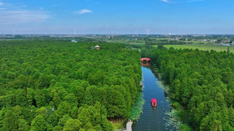 与此同时,荷叶田田的水道旁,高大茂密的池杉遮天蔽日,隔绝了外面的高温,能让杉林深处的游客感受到一份独有的清凉。