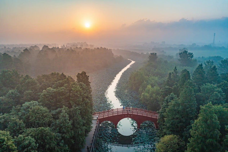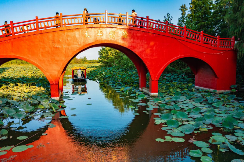 八月下旬至中秋的清水潭,池杉茂密,荷叶铺满了整个河道,乘船而过,“误入藕花深处”的意境在这里被具象化。